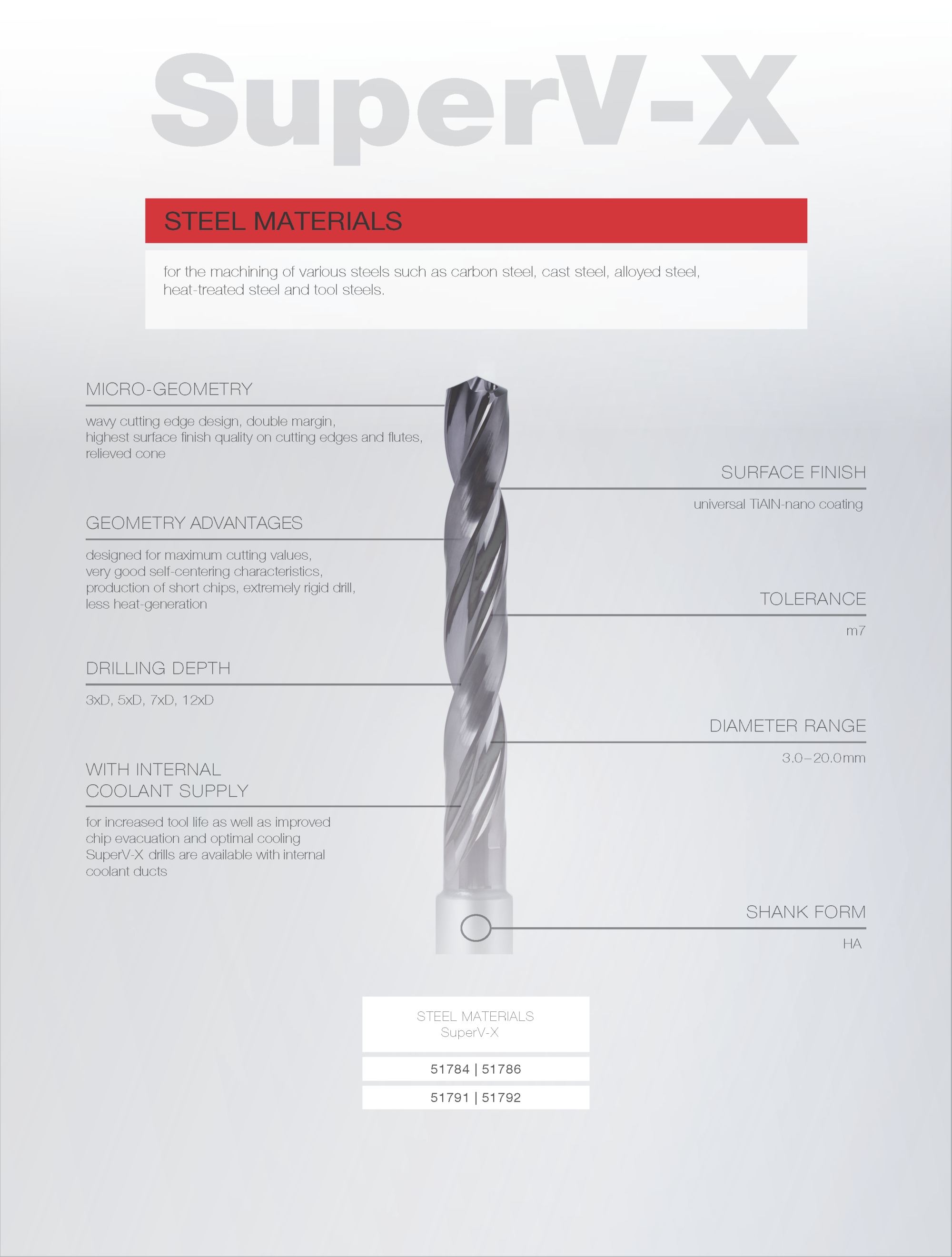 The new SuperV-X drills are especially developed for steel machining with a very high performance. Combined the optimization of all tool parameters this new carbide drill enables highest feed rates and metal removal rates.The newly developed carbide grade performs a balancing act between hardness and toughness. Due to its special structure it has a re-sharpening effect. Breakages that normally accelerate tool wear no longer occur. The micro-geometry honing process ensures a uniform hone resulting in a stable and efficient cutting edge.